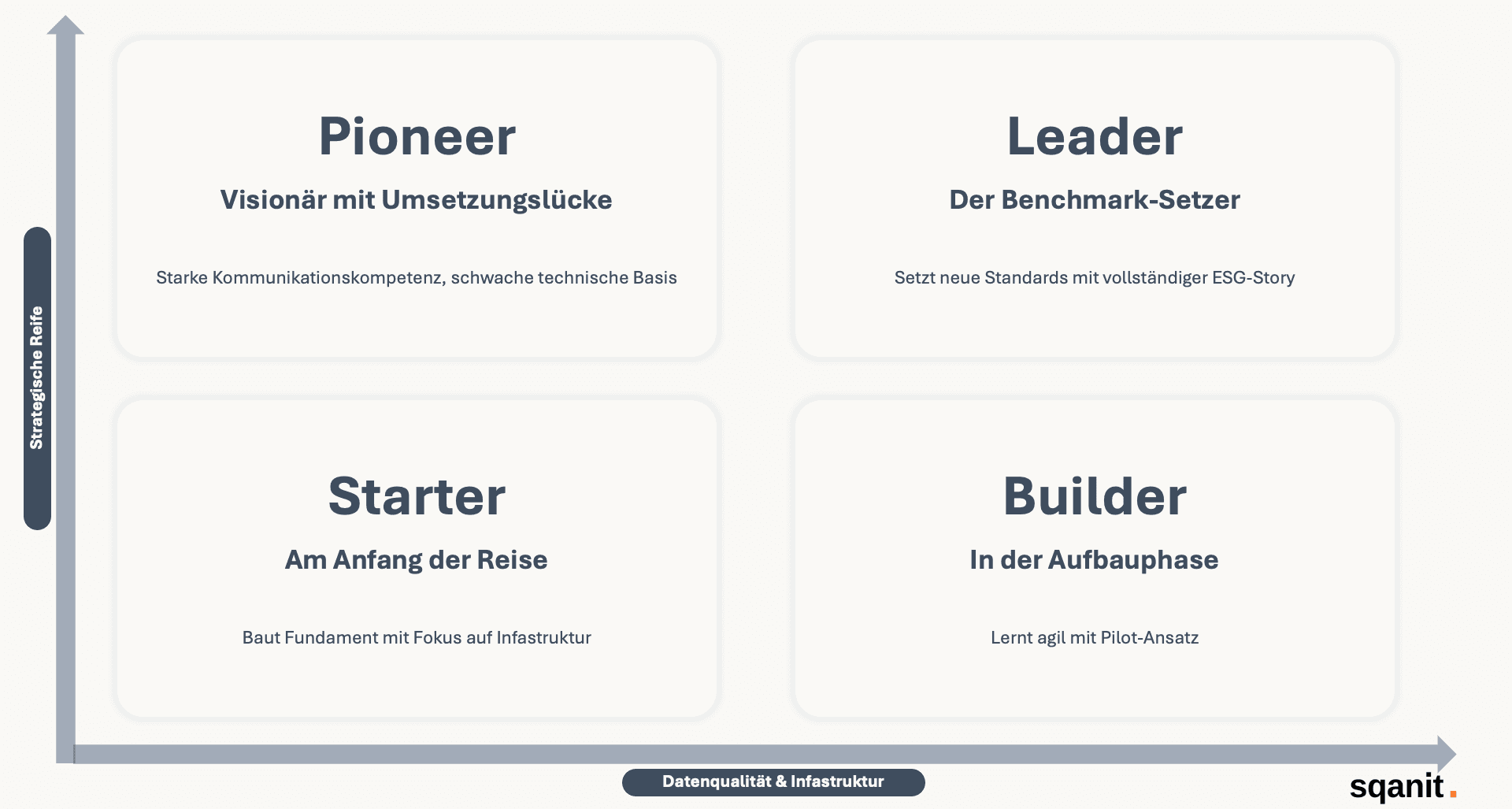 Profil: Klare ESG-Vision und Commitment auf C-Level, aber fragmentierte Datenlandschaft. Starke Kommunikationskompetenz, schwache technische Basis.